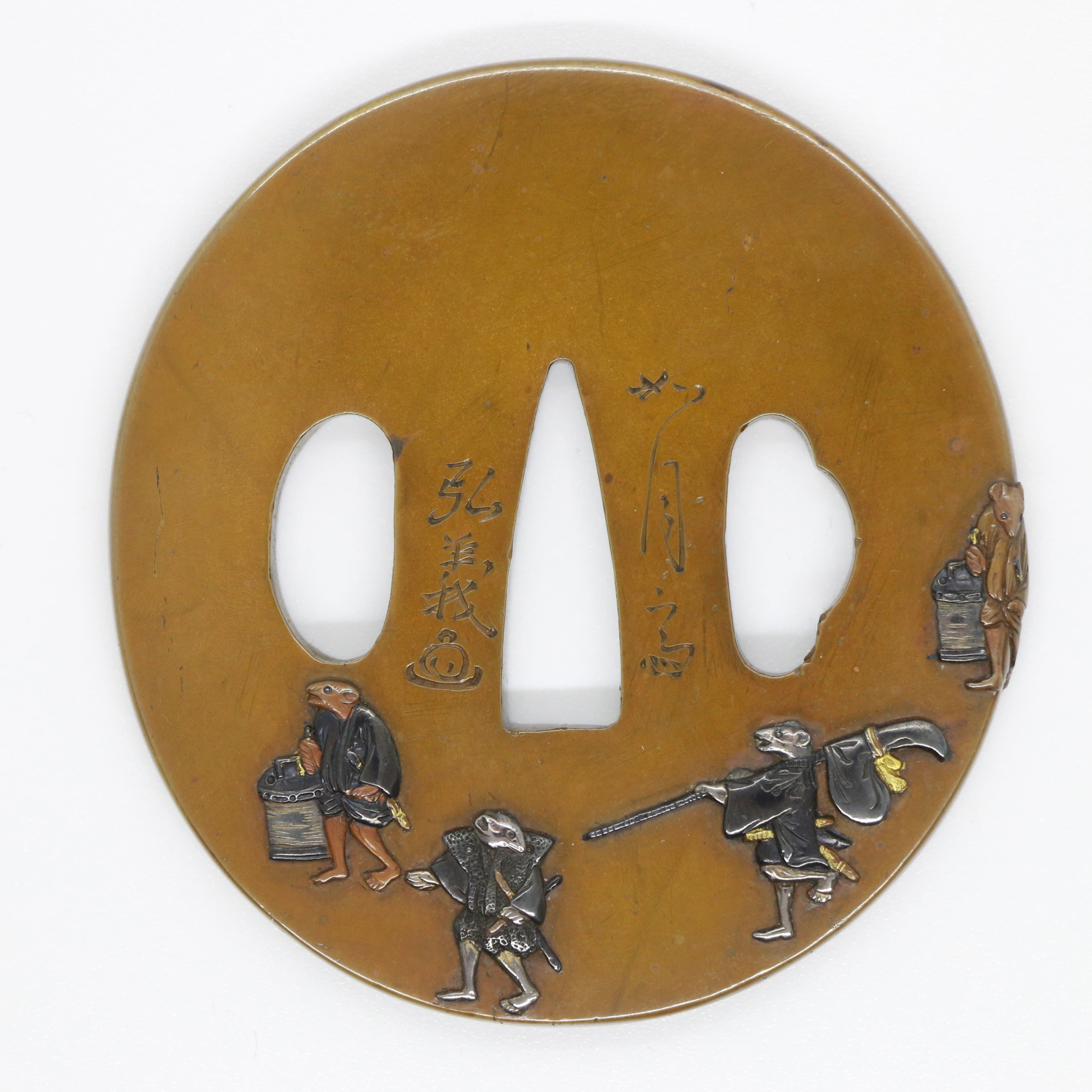 弘義は弘寿の門人で如月斉と号す。本作は表は高彫り色絵で裏は毛彫りとなり手が込んでいる。表から裏まで絵がつながっていて鼠の大名行列の図となっている。洒落ていて何とも可愛らしい作品である。